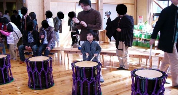 樹齢600年のケヤキの木で作られた大太鼓ずらりと並んだ太鼓たち。太鼓の響きをたたいて聴いてみて触って全身で感じよう!!