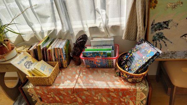 1階お風呂前に絵本コーナーがあります。お部屋に持っていかれても構いません。大人でも感動する絵本もあります。